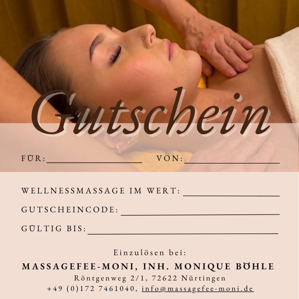 Gönnen Sie Ihren Liebsten eine wohlverdiente Auszeit. Mit einem Gutschein für meine wohltuenden Wellnessmassagen schenken Sie pure Entspannung und Wohlbefinden – das perfekte Geschenk für jeden Anlass.